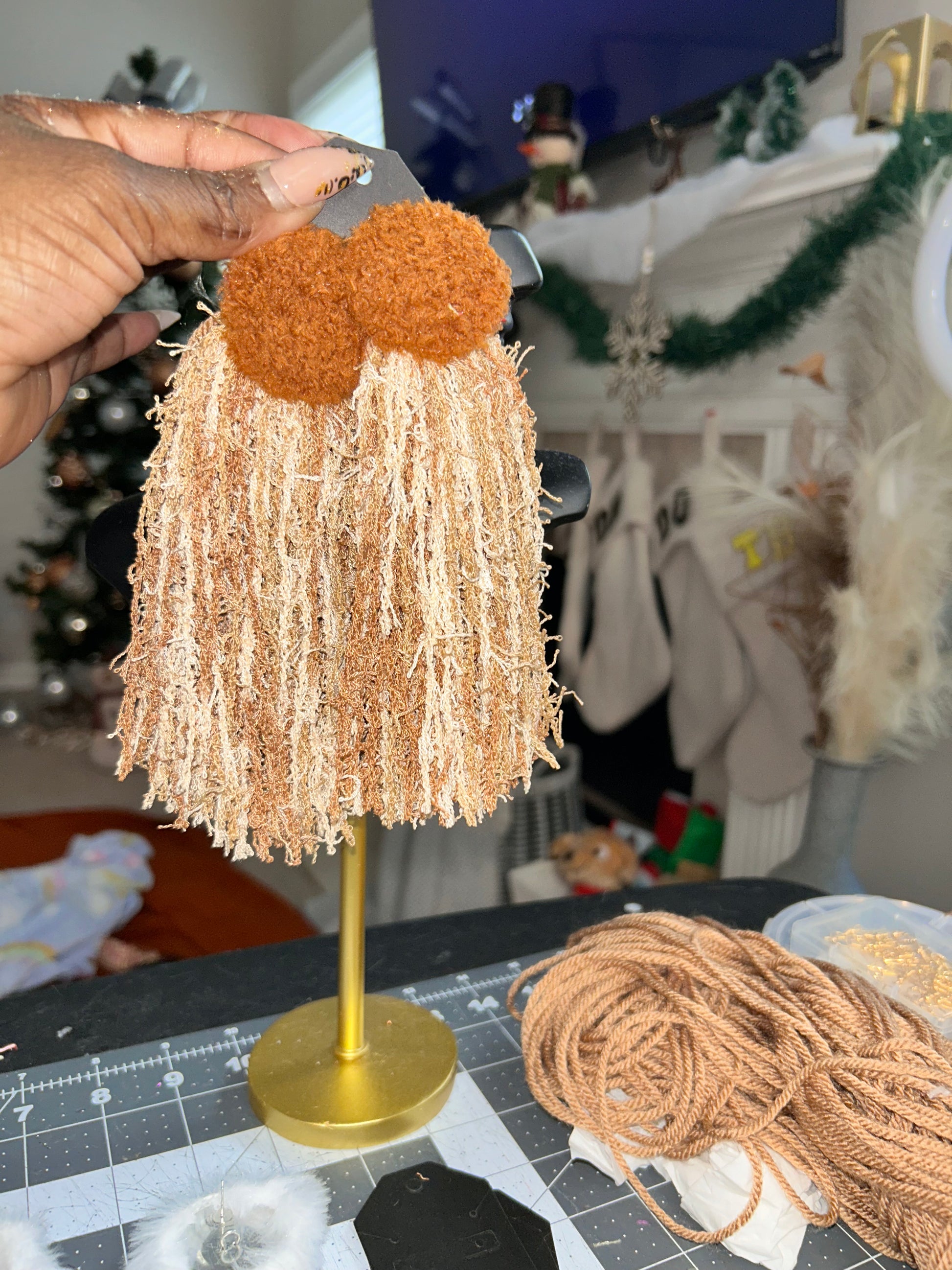 Cozy meets bold with our bearable sherpa Fur & Distressed yarn earrings-warm, textured, and effortlessly stylish. these handmade statement earrings feature soft caramel toned sherpa fur paired with distressed cream and brown yarn, creating a rich earthy look that's both comforting and eye catching. perfect for neutral lovers who still want a standout piece.