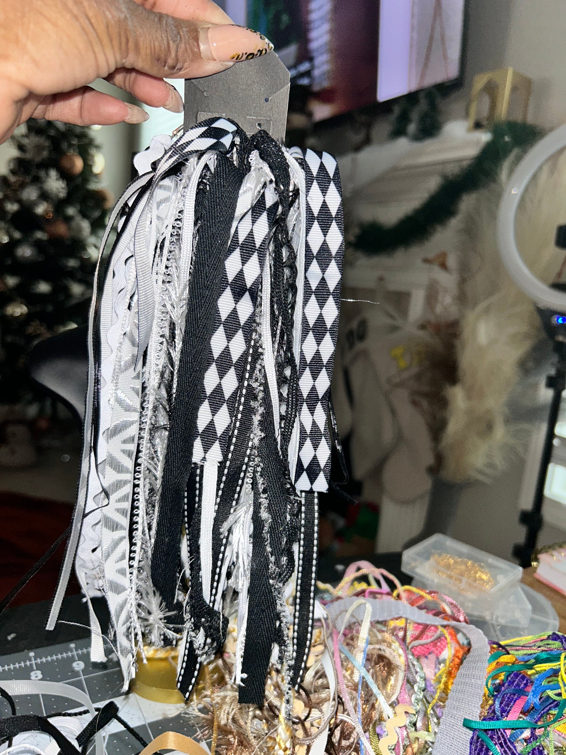 black and white and silver shredded ribbons on a hoop with black and white checkered ribbon accents