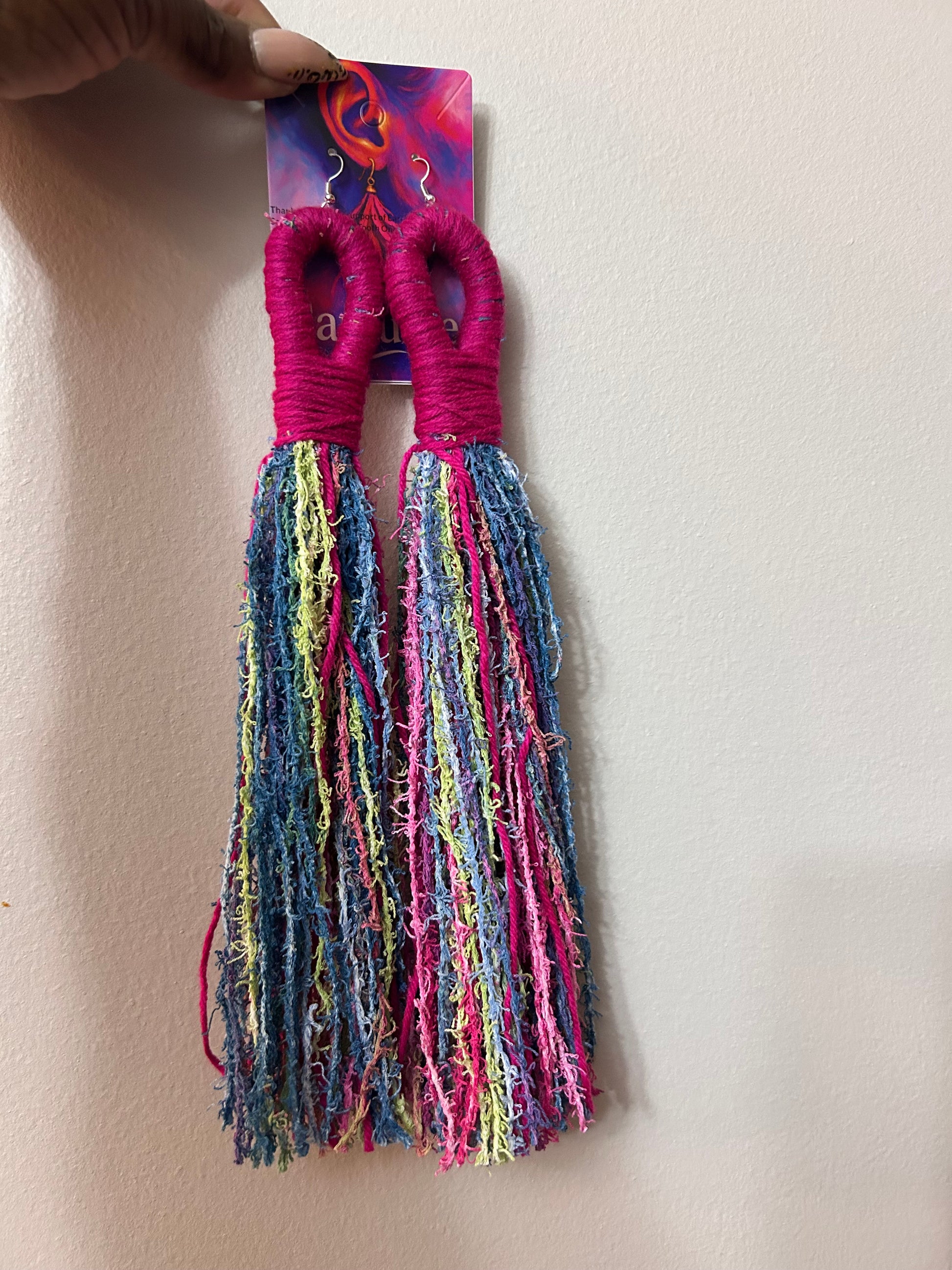 urban fringe earrings feature vibrant multicolor yarn paired with a sleek leather tassel for a bold mix of texture and edge. Lightweight, handmade, and full of flavor.